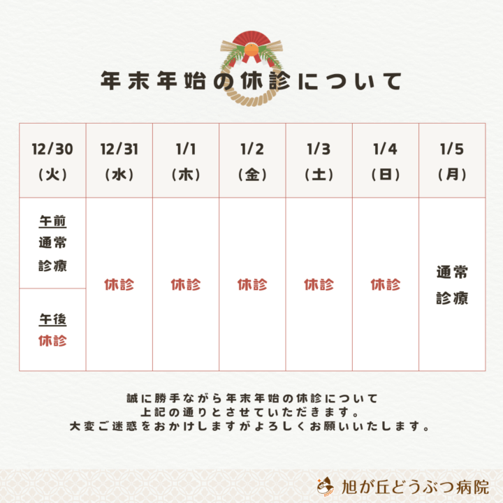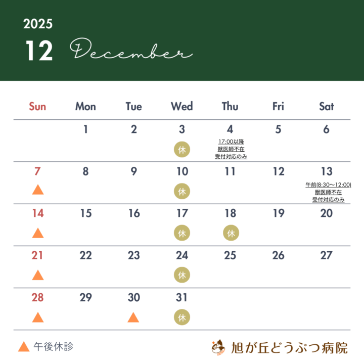 12月の診療カレンダー/年末年始の診療について 2025.12.04 Blog / News こんにちは! 三重県鈴鹿市の旭が丘どうぶつ病院、スタッフ浜地です! 12月に入り朝晩かなり冷え込んできましたね。 今年ももうあと残り1ヶ月…早いですね 先日病院入口にスタッフが毎年恒例のクリスマスツリーを出してくれました♪ 実は院内BGMもこっそりクリスマスソングに変わってるんですよ〜! 来院された際はぜひ聞いてみてください! ▽12月の休診日をお知らせします▽ prev 一覧にもどる new